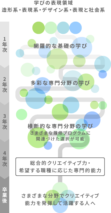 「造形」系、「表現」系、「デザイン」系の表現領域と人や社会の支援を中心に据えた「表現と社会」系を設置。