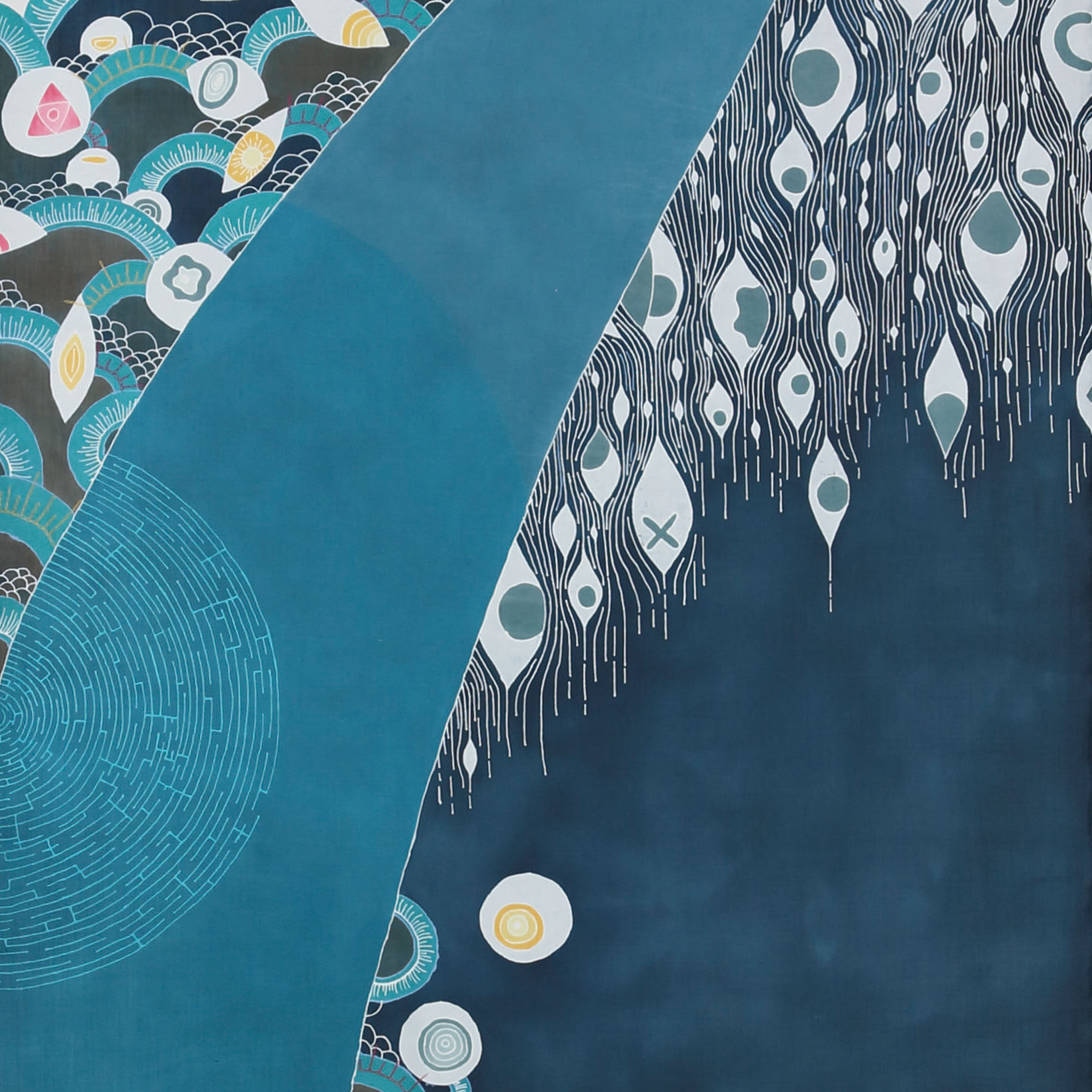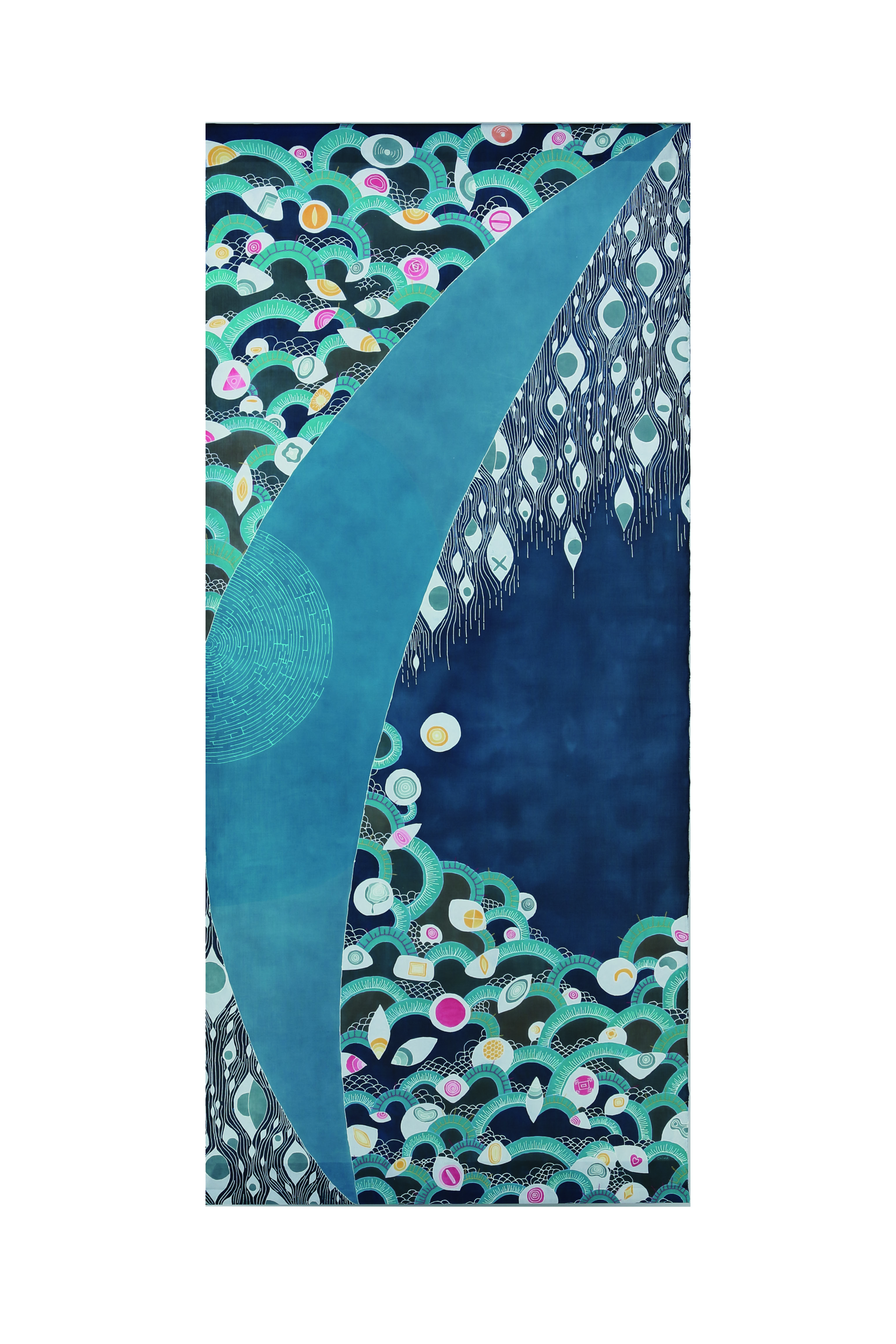 主に、授業で学んできた型染め、友禅染めや、関連分野で学んだデジタルプリント、ミシンワークなどの技法を用いた作品制作をしています。今年は平面作品だけでなく、ファッションに関わる作品に挑戦しているゼミ生も多くいます。表現方法や世界観もそれぞれですが、教授の早瀨先生、助手の高橋さんにご指導いただきながら制作を進めてきました。私たちの個性豊かな作品をぜひご覧下さい。