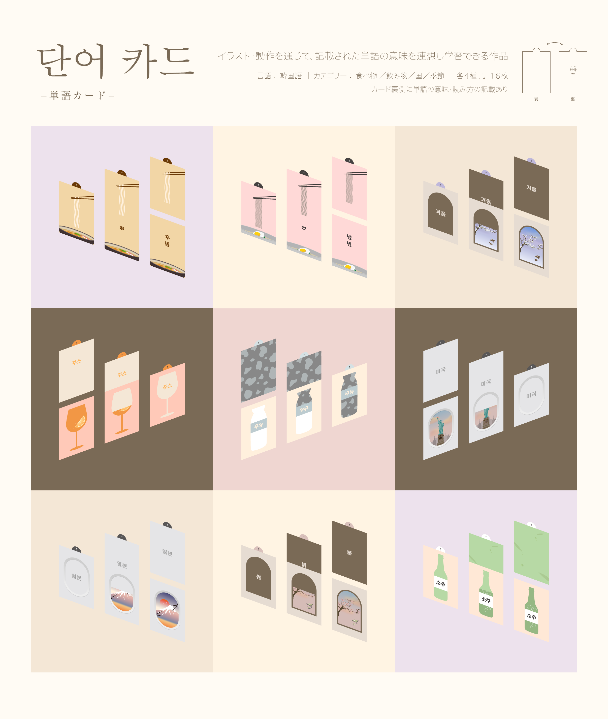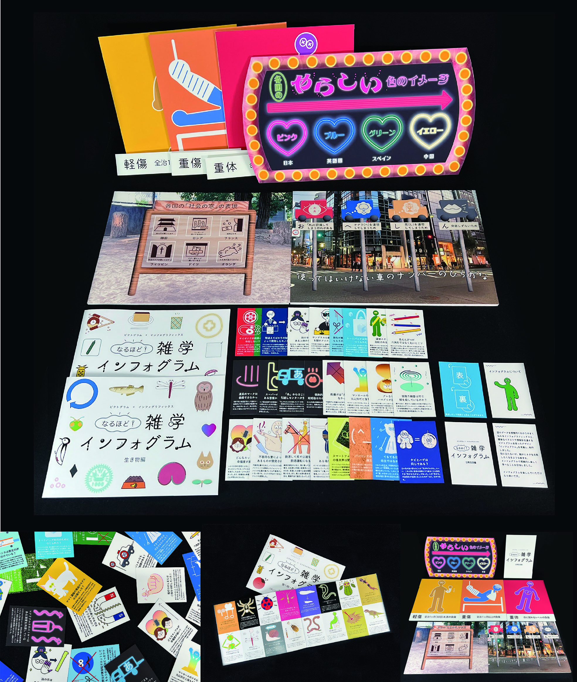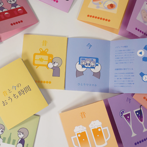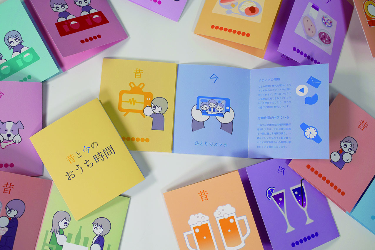 媒体をただ「見せる事で伝える」だけでなく「見せて伝える事により人の心を動かす」モノを作ることが、視覚・コミュニケーションデザインゼミで行われる活動です。学んできたグラフィックデザインの知識を用いて、対象を魅力的に伝えるための作品を作ります。また、入学してからこれまでに学んだスキルを活かし「人と人との間のコミュニケーションをデザインすること」を意識しながら、制作を行いました。
