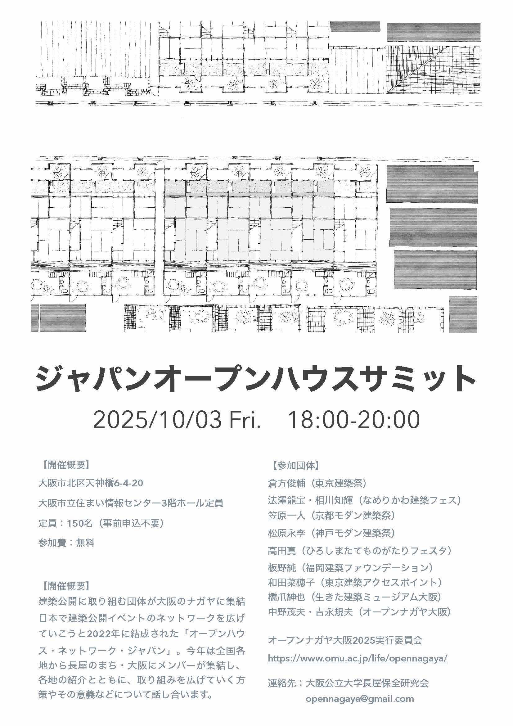 日本で建築公開イベントのネットワークを広げていこうと2022年に結成された「オープンハウス・ネットワーク・ジャパン」。今年は全国各地から長屋のまち・大阪にメンバーが集結し、各地の紹介とともに、取り組みを広げていく方策やその意義などについて話し合います。場所:大阪市立住まい情報センター3階日時:10月3日 18時ー20時