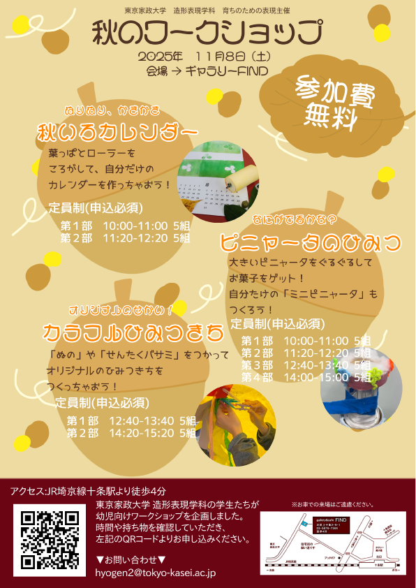 造形表現学科育ちのための表現研究室では11月8日(土)に「秋のワークショップ」が開催されました。ワークショップの詳細は、下記URLよりご確認ください。https://tokyokasei-autumn-ws.peatix.com/