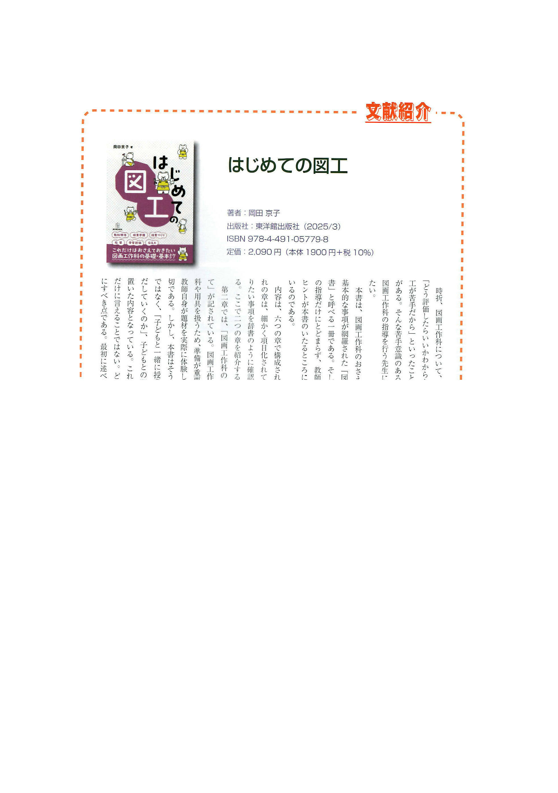 育ちのための表現研究室 岡田京子(教授)が出版した『はじめての図工』の書評が月刊誌『教育美術』に掲載されました。 (画像は一部を抜粋しております)