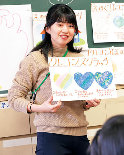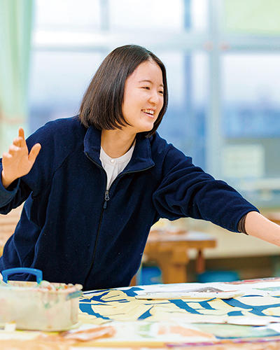 高校では合唱部に所属し、ステージ背景や小道具も作っていました。それを見た顧問の先生に「造形で表現することが向いているね」と言っていただいたことが、造形表現学科を選んだきっかけです。絵画や陶芸など輻広い分野を学び、自分のやりたい表現方法を見つけるのにぴったりだと考えました。現在、図工専科の教員として、3〜6年生11クラスの授業を担当しています。特に教材研究に力を入れているのですが、索材や大きさなど試行錯誤を繰り返し、自分も子どもも「これなら絶対に楽しい」と思えるものを追求します。準備は大変ですが、授業ではいつも私の想像を超えた新しい発見があり、子どもたちが成長したなと実感できた時はとてもやりがいを感じます。図画エ作は扱う領域が広いので、大学の造形表現学科で学んだ輻広い知識や技術的なスキルが役立っています。また、校外でのアートプロジェクトやボランティア活動でさまざまな価値観の方と関わり、そこで培ったコミュニケーションカがこの仕事に生かせていると思います。"好き"を仕事にできているのは幸せなことです。また、図工専科に限らず小学校の教諭は、産休・育休後も復掃しやすく、将来のビジョンが描きやすい職業だと思います。今後は、家庭も仕事も充実させて、何事にも前向きに挑戦していきたいと考えています。