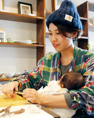 就職活動をしながらも「これは自分のやりたいこととは違う」と感じていました。そこで、いったん立ち止まり、自分は何をしたいのかを考えた結果、イベントで自分の作品を買ってもらったときのうれしさ、自分が認められたような感覚を思い出し、自分の作品を販売する仕事に就きたいと思いました。昔からものづくりが好きで、大学では陶芸や金工・ジュエリー制作なども学んでいました。ちょうど実家が所有するビルのテナントに空きがあったので、ものづくりを学んだ経験を生かして雑貨店をオープンすることにしました。店内に置く家具、陳列棚は自分で作るなどして極力経費を節約。商品も自分のアクセサリーに加え、ハンドメイドイベントなどで作家を探し、委託販売という形でそろえていきました。現在は、2ヶ月に1回お店でワークショップも開催しています。開催を待ちわびてくれている人いて、楽しそうに作っている様子を見ると、私もうれしくなってきます。出産し、今は育休中です。仕事に就く前は、子どもができたら仕事は辞めるものと漠然と思っていました。しかし、今の自分にとって仕事は生きがいの一つ。仕事と子ども、どちらかを選択するのではなく、子育ての環境を整え育児と仕事を両立し、このお店からさまざまな場所へ、笑顔になれる商品を届けたいです。