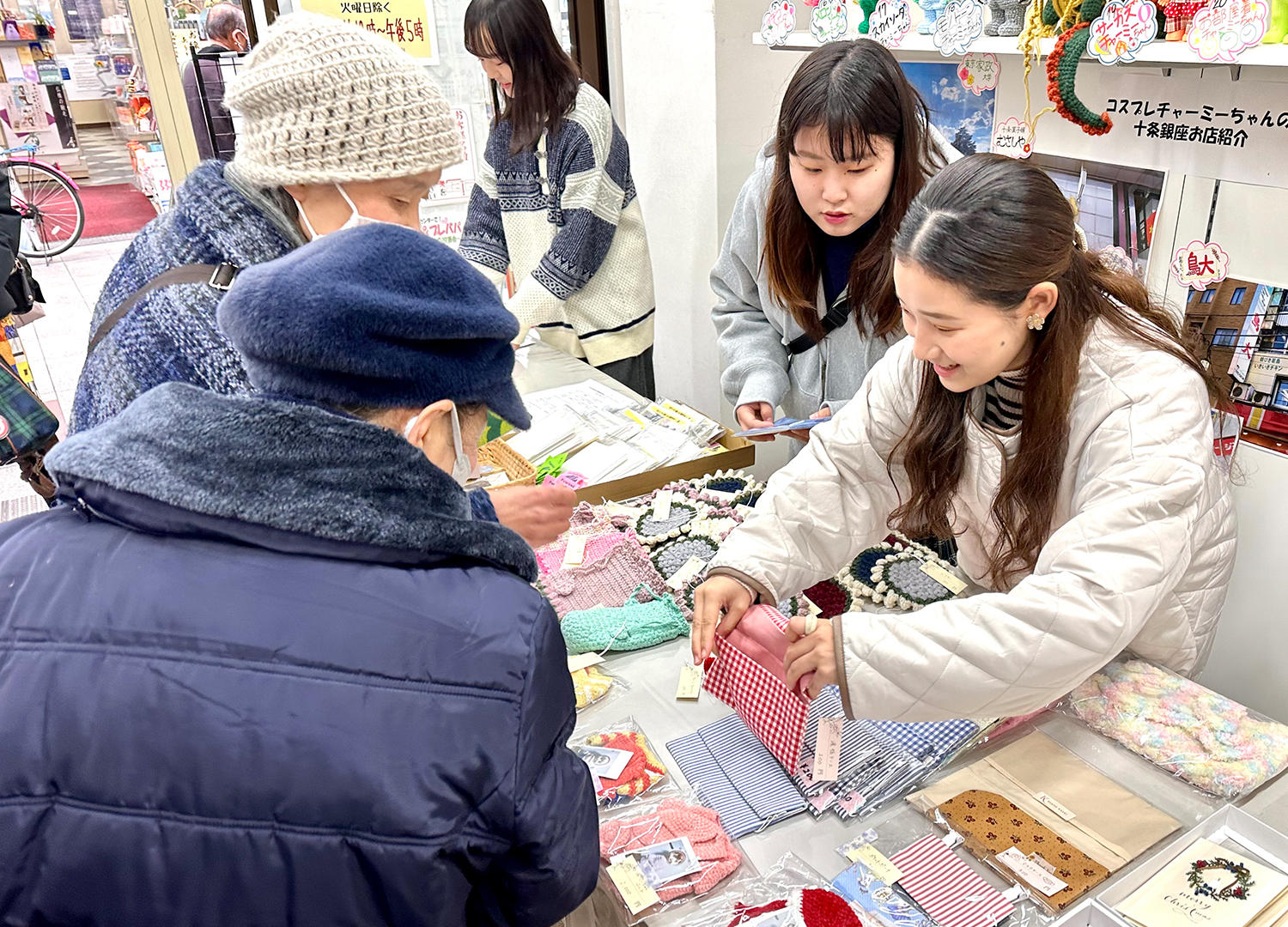 学生が作った子ども服や手芸小物、編み物などを十条銀座商店街で販売します。東京都北区と十条銀座商店街振興組合の協力により毎年二月初めに開催、地元のご年配の方やお子様連れによろこばれて13年続いています。