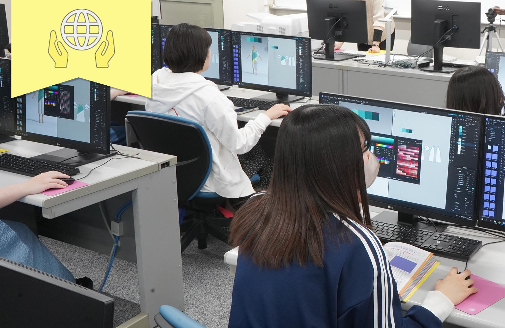 サステナビリティの概念に基づいた服飾ビジネスやDXに対応した学びを強化。アパレル向けの3Dモデリングソフト〈CLO〉の実習にも力を入れています。生産管理や品質管理といった工業製品としての服づくりに必要な知識を学び、卒業後に活躍できる力を身につけます。