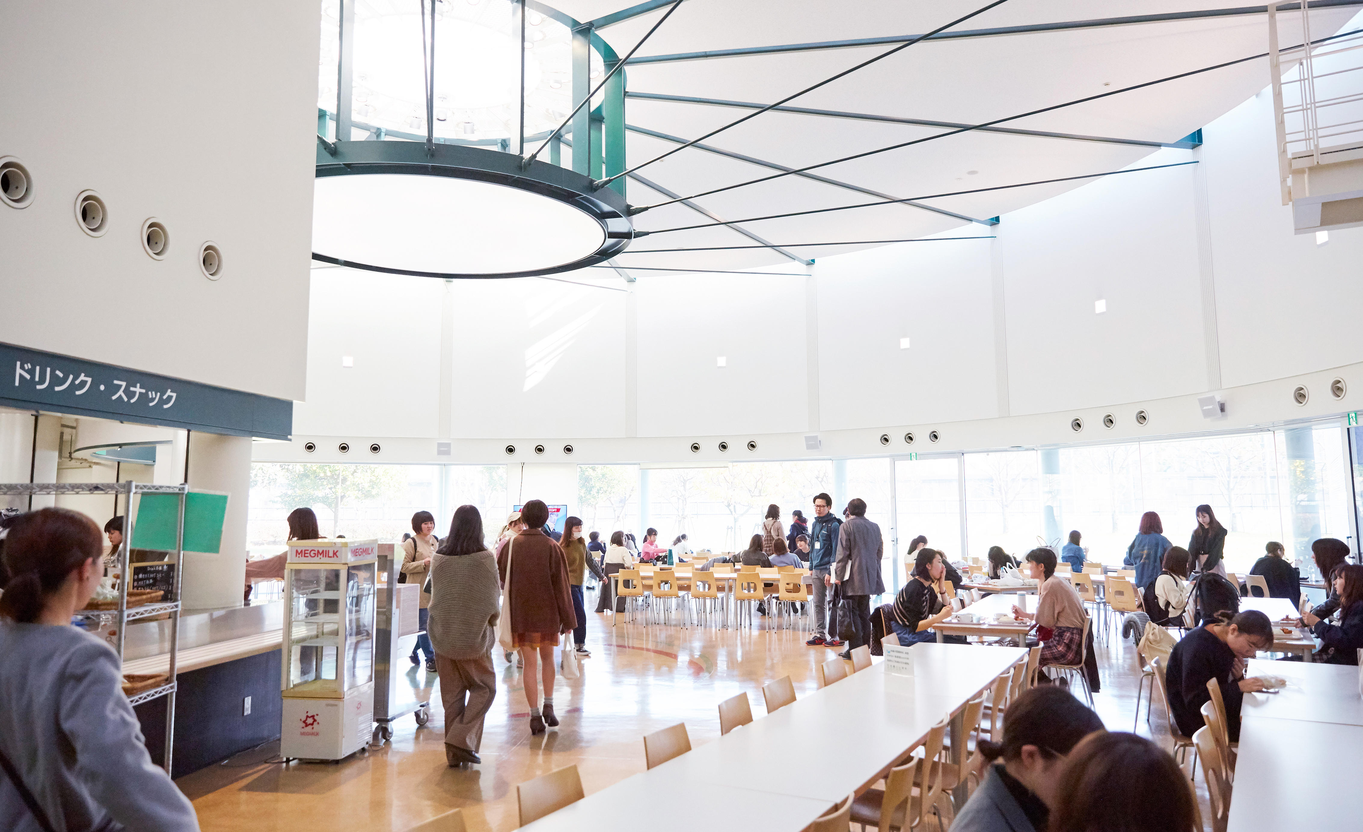 16号館の1階にある、光あふれる明るい学食。ランチやティータイムも楽しめます。