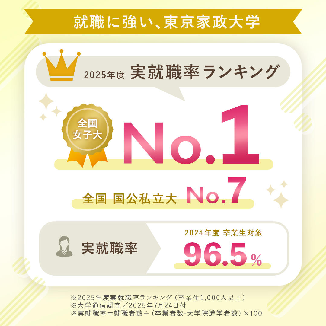 東京家政大学の2024年度卒業生の実就職率(96.5%)が、「2025年度実就職率ランキング」で、全国女子大学1位を達成しました。(大学通信調査/7月24日付)。