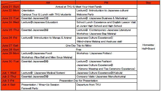 Thank you for your interest in the TKU Summer Program. Under the leadership of the Global Education Center the University runs the TKU Summer Program to promote international exchange and strengthen ties with partner universities abroad. The program aims to deepen students' understanding of Japan and Japanese culture through lectures on various themes, Japanese language study, homestays, cultural experiences, and exchanges with TKU students, as well as events based on fields in which TKU specializes.