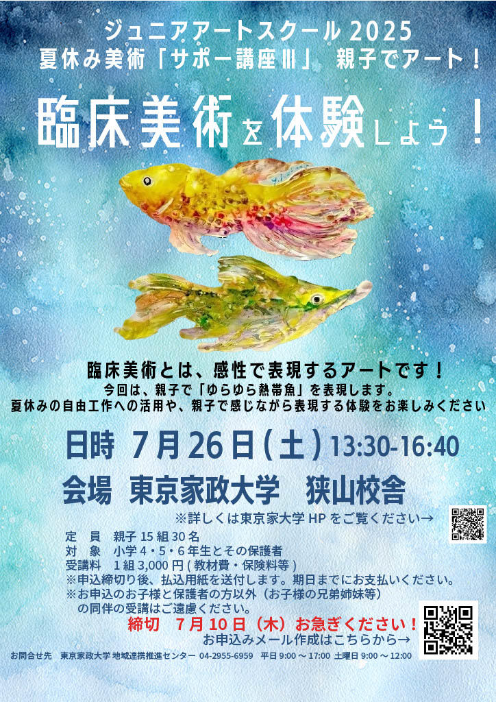 | 内容 | 魚の形や動きを自由に表現する、粘土のマチエールと色彩表現の魅力を感じながら熱帯魚を表現します。親子で作る作品のそれぞれの個性も楽しめるでしょう。 |