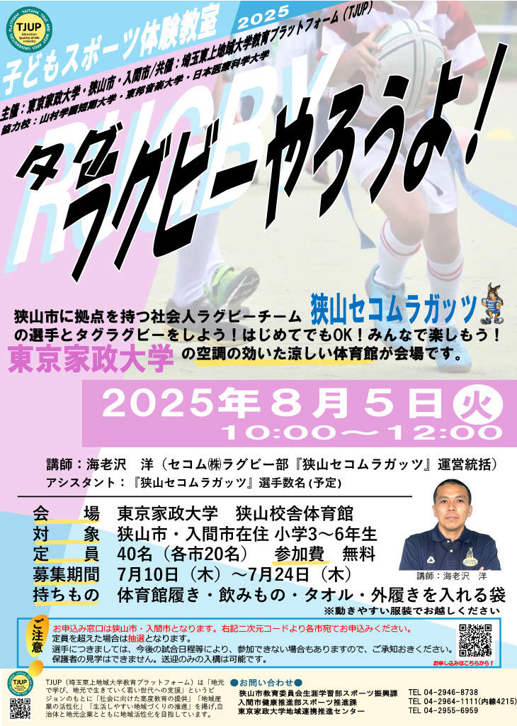 狭山市に拠点をもつ社会人ラグビーチーム「狭山セコムラガッツ」の選手と触れ合い、タグラグビーの体験をし、