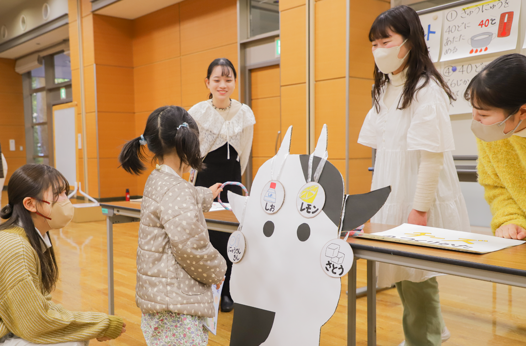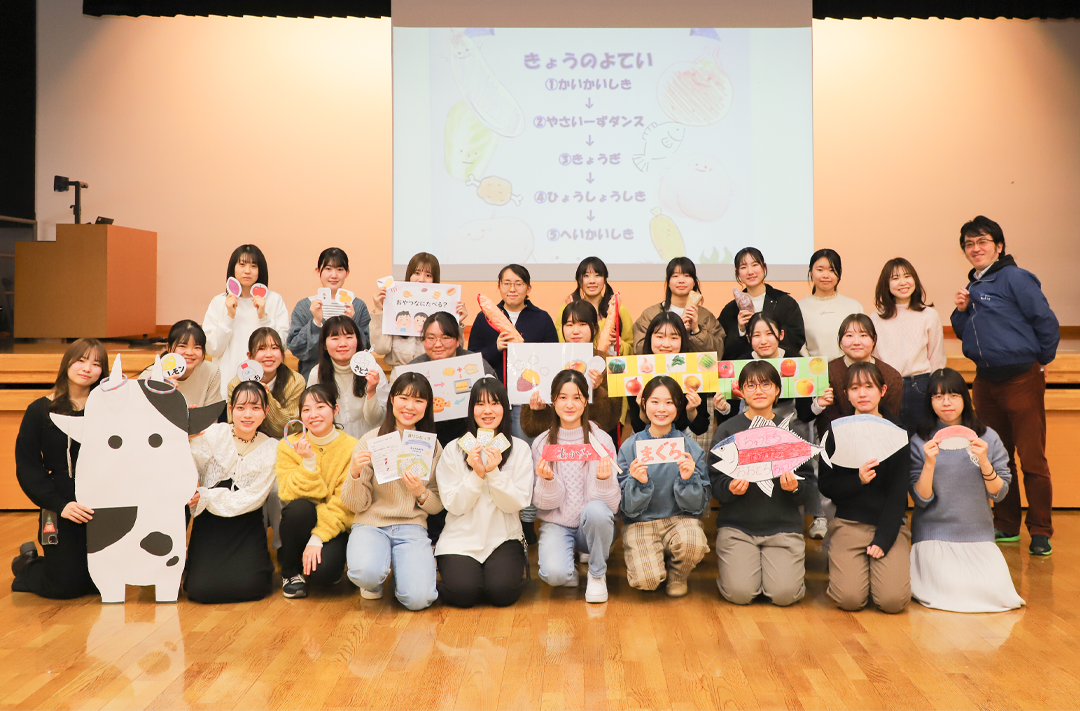2021年度に引き続き附属みどりケ丘幼稚園とコラボレーションし、「第16回食リンピック」を開催しました。学生はそれぞれの担当部門やグループに分かれて企画を進め、競技内容について幼稚園の先生のアドバイスを受け、試行錯誤しながら6種類の競技形式の食育ゲームと掲示物を完成させました。イベント当日は園児と学生が準備体操として、一緒にダンスを踊ったり、クイズやパネルシアターを見ながらイベントを楽しんでいる様子が見られました。学生は園児との交流を通して、一緒に楽しみながら食の大切さや園児との関わり方を学んでいる様子でした。食リンピック終了後には保護者向けに当日の様子や食に関する冊子を制作し配布しました。