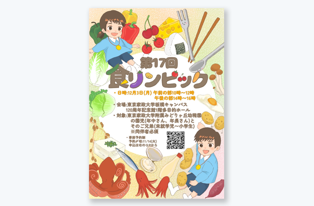 概要 :子どもから高齢者まで、幅広い世代の方々が五感を使った食育ゲームを競技形式で楽しむ本学発祥の食育イベントです。イベントの企画から競技の考案、ポスター制作などの広報活動まで、学生有志団体 食リンピック実行委員会が主体となり運営しています。食リンピック実行委員会では、様々な学部学科・科の学生が協力し、それぞれの学びや特技を活かして活動しています。