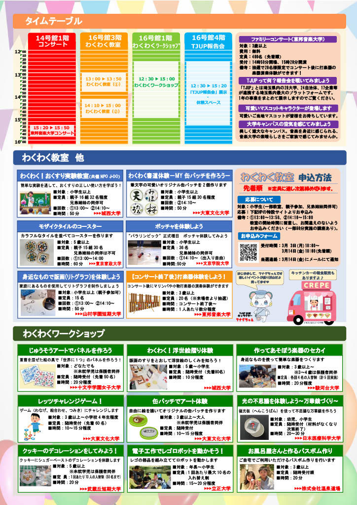 TJUP(埼玉東上地域大学教育プラットフォーム)とは、埼玉県の東武東上線沿線および西武線沿線の「大学」「自治体」「企業」が連携するプラットフォームであり、「地元で生まれ、地元で育ち、地元で生きていく若い世代への支援」というビジョンのもと、2018年に発足されました。本学は、2018年に加盟し、「学生のための事業を共同で推進」する『学生イベント交流委員会』 (東邦音楽大学・武蔵丘短期大学・山村学園短期大学・日本医療科学大学・東京家政大学)に所属しています。会員校と連携しながら、学生交流や地域と学生との交流を通じて、学生の自立性や社会性、コミュニケーション力を培う活動を行っています。