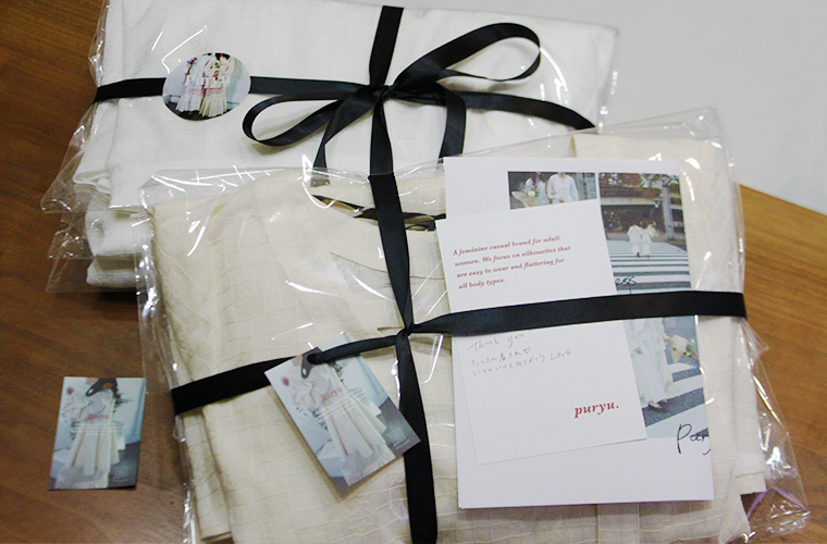 ブランド名:Puryu ブランド名は、フランス語の「pur=純粋」という言葉に、私たち二人の名前「yuu」と「yuka」の頭文字を組み合わせて名付けました。大人になっても人目を気にせず純粋な心でファッションを楽しんでほしいという願いが込められています。